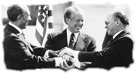 Here is the handshake between Menachem Begin, Z"L, and Anwar el-Sadat on March 26, 1979, at The White House in Washington, that ended the state of war between Israel and Egypt. President Jimmy Carter of The United States watches on.